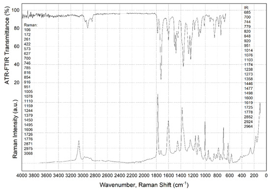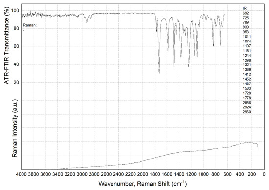 The IRFS analysis was carried out by attenuating the total internal reflection (ATR) spectroscopy. The ATR spectra were recorded with a Nicolet 5700 (FTIR-Fourier spectrometer, Thermo Fisher Scientific Inc., Waltham, MA, USA) equipped with a single ATR attachment on a Ge crystal in a range of 4000–650 cm−1 with a resolution of 4 cm−1 and a number of scans of 64. Raman spectra were registered using the same spectrometer and a Raman module. The exciting laser wavelength was 1064 nm, and the number of scans was 64.