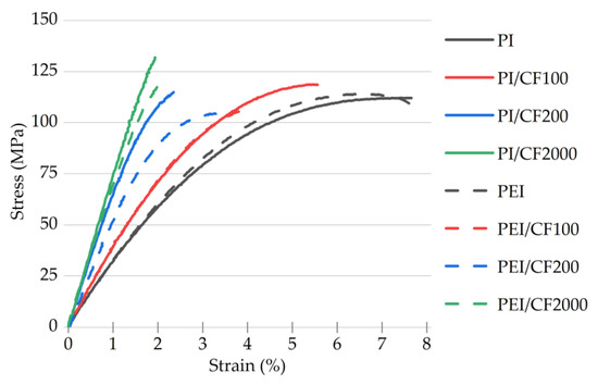 The engineering stress–strain curves for the PI- and PEI-based composites loaded with SCFs of various lengths.