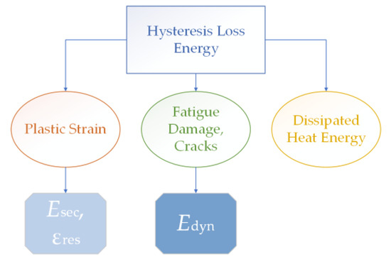 The loop area S reflected the damping properties of the material under cyclic loads, where the amount of unrecovered elastic energy was associated with heat dissipation, damage development, and plastic strain (see the diagram in Figure 6). In the case of the considered amorphous polymers and their composites, the dynamic modulus Edyn was a characteristic of a change in stiffness due to the accumulation of scattered damage and microcracks (since the initiation and propagation of the main crack in terms of the hysteresis loops could not be detected and evaluated). According to this mechanism, the fracture occurred during the elastic strain’s development, which is most pronounced in the HCF mode. In turn, the secant modulus Esec and residual strain εres quantitatively characterized elongation (due to a cyclic creep) and typically reflected the specifics of the fracture processes caused by the development of the plastic strains under LCF conditions.