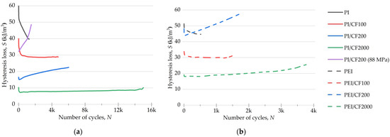 Variations in the area of the mechanical hysteresis loops under cyclic loads are shown in Figure 7. At the beginning of the fatigue tests, the hysteresis loss for the neat PI was slightly higher than that for the neat PEI (60 and 50 kJ/m3, respectively). Both polymers were characterized by a gradual decrease in their loop area with an increase in the number of cycles. At the same time, the loss decreased to 40 kJ/m3 for the neat PI, but it decreased only to 45 kJ/m3 in the neat PEI case. For the PI/CF100 and the PEI/CF100 composites (according to Table 2), the S values were similar (~30 kJ/m3) from the very beginning of the tests, and they remained almost unchanged until the tests were completed.