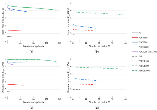The fatigue test of the PI/CF200 composite at a load of 88 MPa (which was in the order of its offset yield stress) showed that the initial values of both moduli were the same as at a load of 74 MPa. Nevertheless, a sharper decrease in both moduli was observed at 88 MPa. Such behavior for the secant modulus was close, including its level of 9–10%, to that for the PEI/CF200 composite (Figure 9).