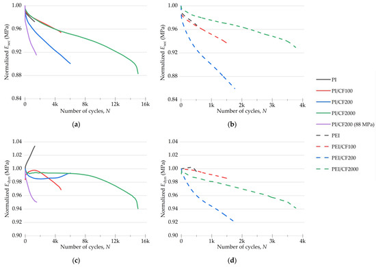 The changes in Esec secant (a,b) and Edyn dynamic (c,d) moduli for the PI- and PEI-based composites under cyclic loads; normalization was made over the initial values.