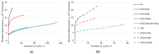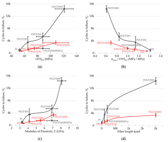 The authors noted that all materials (both the neat polymers and their composites) were tested at the same load level, which was both significantly above and below the offset yield stresses. At the same time, the offset yield stresses (and the elastic modulus) could differ for identical types of reinforcing fibers (SCFs of the same type and length). In the PI/CF200 case, increasing the maximum cycle load up to 88 MPa resulted in similarities both in the loop area and the fatigue life compared to the PEI/CF200 composite. On the other hand, the residual strain was significantly lower for the PI/CF200 specimen than the PEI/CF200. Thus, the fatigue life of the composites was determined not only by the molecular structure of the matrix but also by their offset yield stress.