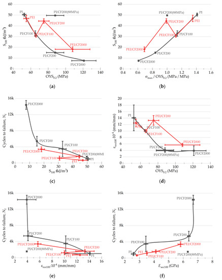 In general, there was a linear decrease in the loss rate as the length of SCFs increased for both types of composites under LCF conditions. Both the neat PI and PEI showed almost the same level of hysteresis loss and general behavior in the fatigue tests. Similarly, the PI- and PEI-based composites loaded with CF100 were similar both in initial S values and their dynamics. However, in this case, the PEI-based composites filled with PAN SCFs (CF200 and CF2000, according to Table 2) possessed an enhanced level of losses compared to the PI-based ones. Thus, there is a different effect of PAN SCFs (Table 2) on the mechanical behavior of the polymers, which (without fillers) were similar in chemical composition and mechanical properties.