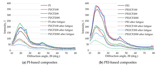 - The determining role of the accumulation of cyclic damage in the neat PI and PEI, as well as their composites reinforced with SCFs, was confirmed by the results of the XRD spectra analysis.