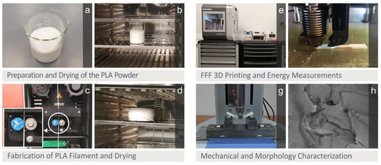 Experimental process (a) PLA raw material, (b) drying process for the raw material, (c) extrusion process for filament production, (d) drying of the filament, (e) measurements for the energy consumption during the FFF MEX 3D printing process, (f) FFF MEX 3D printing, (g) tensile experiments, (h) SEM images acquisition for the morphological characteristics’ evaluation.
