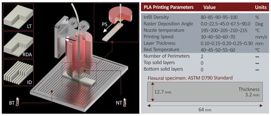 Herein, six generic, machine-independent 3D printing settings were simultaneously studied for their effect on the energy consumption and flexural properties of FFF MEX 3D printed parts. The interactions between them and the importance of each parameter and each level on the metrics were investigated. The 3D printing settings studies were Raster Deposition Angle (RDA, deg), Layer Thickness (LT, mm), Infill Density (ID, %), Nozzle Temperature (NT, °C), Bed Temperature (BT, °C), and Printing Speed (PS, mm/min). Each parameter was studied with three different levels and five replicas were tested in each case. Both the parameters and their levels were identified in accordance with the corresponding literature [17]. Such an approach on a full factorial experimental scheme would require 5 × 36 experiments, which is not possible to be implemented within the context of the study. Therefore, the Taguchi design approach was followed [62]. An L25 orthogonal array was compiled.