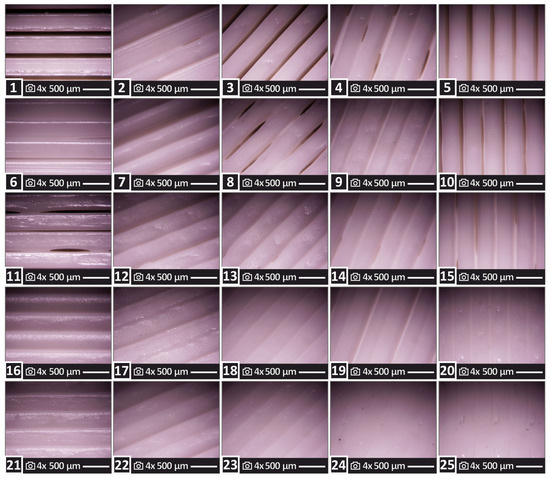 Figure 3 shows optical stereoscope images at 4× magnification of the top surface of a sample for each one of the twenty-five runs. A randomly selected sample out of the five tested in each run is shown in each image. A good quality 3D printing structure without voids or defects is observable in all runs. This indicates that the parameters in both the filament extrusion and the FFF MEX 3D printing process were suitable for the PLA polymer. Still, due to the differences in the 3D printing settings between the runs, the structure of the samples differs, as expected, and the differences are conceivable in the images.