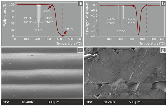 (a) Weight loss (%) vs. temperature (°C) graph produced on the TGA measurements of the specific PLA grade studied herein, (b) corresponding d(weight loss)/dt graph produced during the DSC measurements, and SEM images from (c) the side surface, (d) the fracture surface of a randomly selected sample, after the experimental testing with flexural loading.