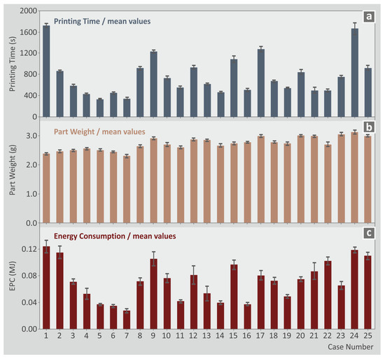 The mean values and the variation for the printing time, part weight, and EPC for the twenty-five runs are shown in a bar chart in Figure 5. This type of layout highlights the changes among the cases assessed for these metrics in a more vivid manner, adding to the thoroughness of the differences between the experimental findings and the significance of the 3D printing settings in the functionality of the manufactured parts. Such differences in the response metrics values justify the need for further analysis of the results. A strong correlation between the printing time and the EPC is observed, as a similar pattern in the bars for the two metrics is observed. The part weight does not seem to follow the same trend, showing a different pattern in the response values of the metric. Overall, the part weight is not significantly changing throughout the runs. In all response metric values, the calculated deviation is rather small, showing the reliability of the experimental results.