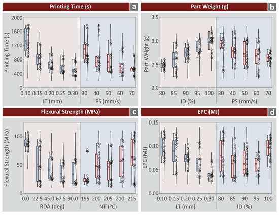 Box plot diagrams for four of the metrics evaluated herein (a) printing time (s), (b) part weight (g), (c) flexural strength (MPa), (d) EPC (MJ).