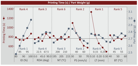 MEPs indicate the effect of each control parameter level on a specific metric studied. Figure 7 and Figure 8 show the MEP for four of the metrics studied, while MEPs for the remaining metrics are available in the Supplementary Data for the study. In the MEP, the control parameters are ranked according to their importance in the metric. For the printing time (s) (Figure 7), ID (%), RDA (deg), NT (°C), and BT (°C) do not significantly affect the metric. LT (mm) and PS (mm/s) increase and reduce the printing time (s) and are ranked as no.1 and no.2 control parameters for the metric. For the part weight (g), RDA (reg), LT (mm), and BT (°C) do not significantly affect the metric. ID (%) is ranked as the number 1 control parameter and its increase increases the part weight (g). The same effect was found with the increase of the NT (°C). The increase of PS (mm/s) decreases the part weight (g) and is ranked as rank 2. Both the printing time (s) and the part weight (g) are related to the energy metrics studied (please see Equations (4) and (5)).