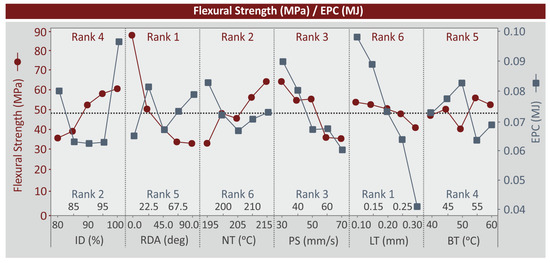 For the flexural strength (MPa) (Figure 8), LT (mm) and BT (°C) have a moderate influence on the metric. The increase of ID (%) and NT (°C) increases flexural strength (MPa). On the other hand, the increase of RDA (deg) and PS (mm/s) have the opposite effect (flexural strength (MPa) decreases). RDA (deg) is the dominant parameter (rank no.1) and LT (mm) is the least important one (rank no.6). For the EPC (MJ) metric, the increase of LT (mm) and PS (mm/s) decreases the metric. RDA (deg) and BT (°C) have a zig-zag response. The RDA (deg) 0 and 45 deg and the BT (°C) 55 °C minimize the EPC (MJ) metric. ID (%) median values reduce the EPC (MJ) while the lowest and highest value increase the EPC (MJ). The mid value of NT (°C) minimized the EPC (MJ), which is higher in higher and lower values of NT (°C). LT (mm) is the dominant parameter for the EPC (MJ) and NT (°C) is the least important one.