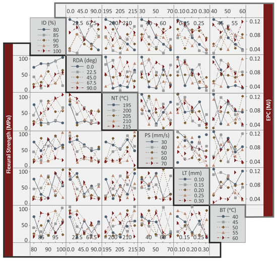 Although the MEPs show the effect of each control parameter in each response metric studied, it does not provide any information about the relations between the control parameters in each metric. To determine such interactions, interaction plots are required that show the synergistic and antagonistic relations between the control parameters. They were formed in the work for all the eight metrics (response indicators) studied and are shown in Figure 9 and the Supplementary Data for the work. Figure 9 shows the interaction plots for the six control parameters for the flexural strength (MPa) and the EPC (MJ) metrics studied. In all cases, antagonistic relations are observed between the control parameters.