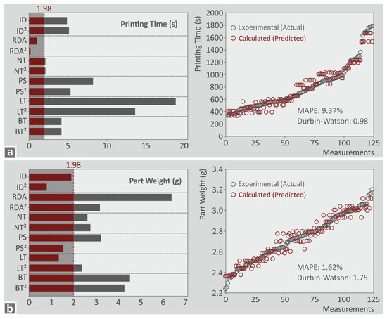 - Printing time (s): all parameters except RDA and RDA2 are statistically important (Figure 10a). MAPE was higher than 5% but lower than 10%, which is considered an acceptable accuracy [67]. Durbin–Watson of 0.98 shows a positive autocorrelation.