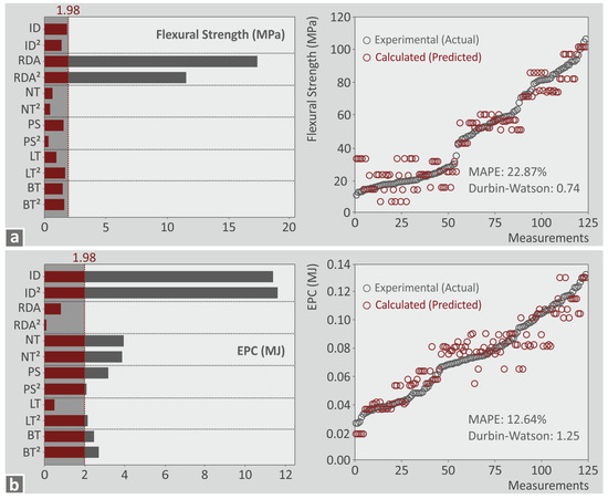 - Flexural strength (MPa): RDA and RDA2 were the only statistically important parameters (Figure 11a). MAPE was 22.87% which indicated that the accuracy of the prediction model is reduced, but still within reasonable limits (less than 25%) [68]. Durbin–Watson of 0.74 shows a positive autocorrelation.