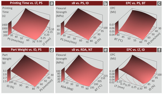 The effect of two (high-ranked) combined control parameters for each metric is presented in the following Figure 12 in a three-dimensional surface graph. Four metrics are depicted, i.e., printing time (s), part weight (g), flexural strength (MPa), and EPC (MJ). PS and LT were the control parameters ranked as no.1 and no.2 for the printing time. Figure 12a shows the printing time vs. these two control parameters. Figure 12b shows the sB metric vs. PS and ID control parameters (rank no.3 and no.4, respectively). Figure 12c shows the EPC control metric vs. PS and BT (rank no.3 and no.4, respectively). Figure 12d shows the part weight vs. the ID and the PS which were also ranked as no.1 and no.2 control parameters for the specific metric. Figure 12e shows the sB metric vs. RDA and NT control parameters (rank no.1 and no.2, respectively). Finally, Figure 12f shows the EPC control metric vs. LT and ID (rank no.1 and no.2, respectively).