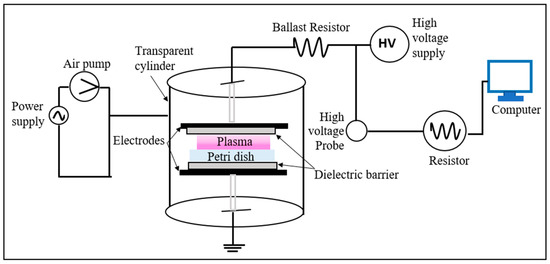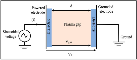 A DBD was generated between the two planar copper electrodes at a 0.2 cm distance (Figure 2). Round electrodes with a 5 cm radius and 0.2 mm thickness were used, which were covered with alumina dielectric layers (εr = 10) of 0.1 cm in thickness [33].