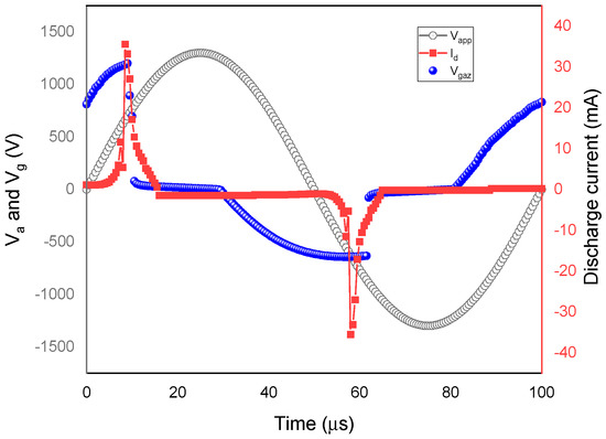 The evolution of the discharge current , the implemented voltages , and the gas voltage during one cycle is plotted in Figure 3. First, a sudden increase in current occurred during the positive half-voltage discharge from 1 mA to a maximum of 32 mA. A breakdown of the gas occurred with the abruptly change in current, and the discharge lasted about 5 µs. Simultaneously, the gas voltage changed from 760 V at t = 0 s to 1200 V at t = 9 µs, at which voltage, the first discharge appeared. As the current peak was reached, caused the extinction of the discharge, and a negative voltage was triggered, announcing the ignition of the second discharge through the subsequent half cycle.