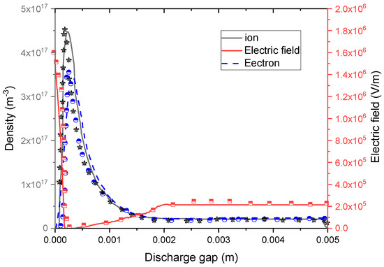 The spatial distribution of the charged particle densities and of the electric field are displayed in Figure 4 at the maximal discharge current (t = 10 µs). The discharge was characterized by four discharge regions like those of DC glow discharge at low pressure [49]. We found (i) a high cathode-fall region, that exhibited a maximal electric field of 16.5 kV/cm resulting from the wide positive space charges close to the cathode.