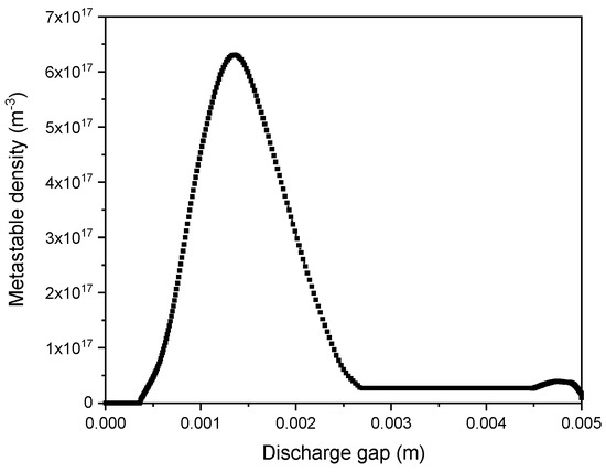 Figure 5 shows the density spatial distribution of metastable helium when there was a maximum discharge current. The metastable density distribution showed a profile similar to the ion and electron density profiles. During the cathode-fall region, a maximum density of 6.3 × 1017 m−3 was reached, while in the positive-column region, it was constant, with a value of 2 × 1016 m−3.