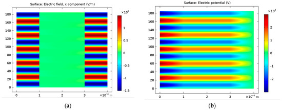 Figure 6 illustrates the spatiotemporal evolution of the electric field (Figure 6a) and potential (Figure 6b) in the interelectrode distance. Indeed, the potential and the electric field changed as a function of the position. The length of the sheath region could be determined with the electric field root-mean-square value [52]. Due to the plasma diamagnetic property, the electric field in the inter-electrode distance was reduced when there was an electrical discharge.