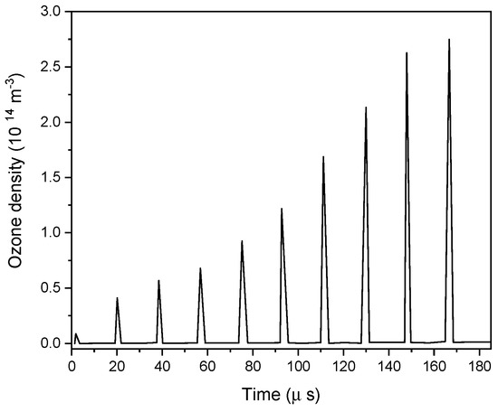 Figure 9 illustrates the significant growing density of ozone. The results showed that ozone accumulated in the gap during every discharge event, reaching a density of 2.8 × 1014 m−3.
