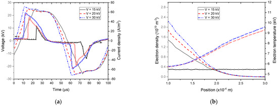 Calculated current density and gas voltage waveforms (a) and spatial electron density and temperature distribution at maximum discharge current (b) for different external voltages.