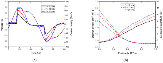 Namely, when rising the external voltage amplitude from 15 kV to 30 kV, the electron temperature changed abruptly. Indeed, an important distortion of the electric field occurred above 15 kV due to the higher space charges emitted by the cathode. A significant rise in electron temperature results from this high gradient in the electric field distribution in the discharge gap [65]. After this abrupt increase, the electron temperature became less sensitive to changes afterward. As shown in Figure 12b, the electron temperature increased slightly with the external voltage frequency.