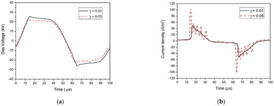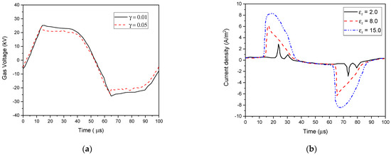 The parameters of barrier material, such as the dielectric constant εr and the secondary electron emission coefficient γi, can significantly alter the discharge characteristics. Their influence on the gas voltage and current properties is shown in Figure 13 and Figure 14 using He–O2 (1% O2) plasma gas. As illustrated in Figure 13b, the γi coefficient of the barrier material influenced the current waveforms in the discharge structure. Several peaks in the current waveform can be seen because of the rising γi coefficient from 0.01 to 0.05. It was found that the number of micro-discharges increased, which reduced their duration in response to a higher electric field [66].