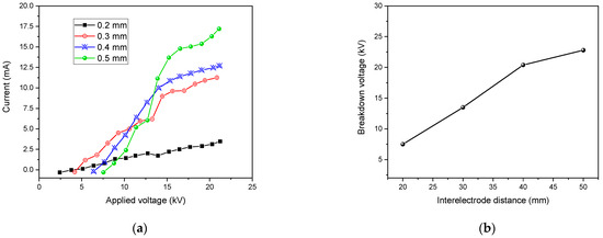 A linear relationship was found between electrode gap and breakdown voltage at atmospheric pressure, as illustrated in Figure 16b.