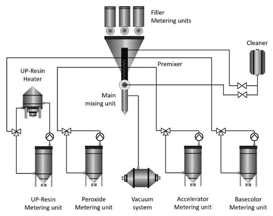 An advanced automated technological complex (RESPECTA, Wulfrath, Germany) was applied to manufacture the polymer composites used in this study, as shown in Figure 1. The main units of the complex that allow the precise and safe production of polymeric composites are filler metering units, a cleaner, a resin heater, a metering unit, mixing and premixing units, a metering unit, and a vacuum system, as well as peroxide, accelerator, and base color metering units.