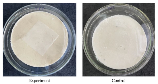 Control and experimental composite samples were placed in individual sterile Petri dishes prior to the experiment. In parallel, 40 × 40 (±2.0) mm polyethylene cover films were prepared. All samples and cover films were sterilized with a 70% ethanol solution.