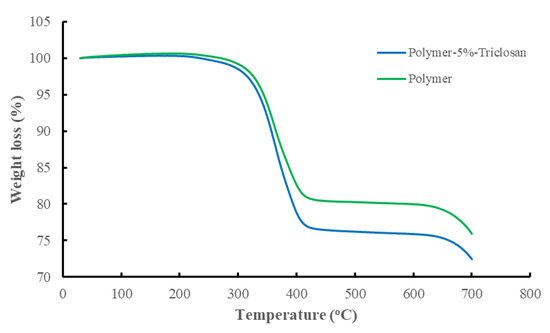 As described in our previous study [36], wherein the same reference and 5 wt.% triclosan-loaded polymer composites were used, the difference in the chemical compositions of the reference and 5 wt.% triclosan-loaded polymer composites revealed a significant alteration in the elemental composition with the antibacterial agent triclosan, wherein 1.67 wt.% chlorine is identified. The latter molecule contains three atoms of chlorine connected to aromatic rings. These account for one-third of the total weight of the triclosan molecule, which closely matches the chemical analysis of the 5 wt.% triclosan-loaded polymer composite (Table 5). Further evidence of the successful modification with the antibacterial agent is the thermogravimetric analysis. The results of thermo-analysis revealed around a 5% weight loss difference between the reference and triclosan-loaded polymer composites, which is due to the molecule of aromatic nature also taking part in carbonization (Figure 3).