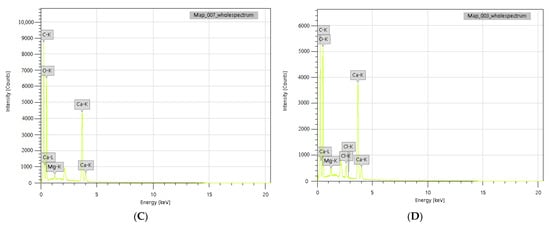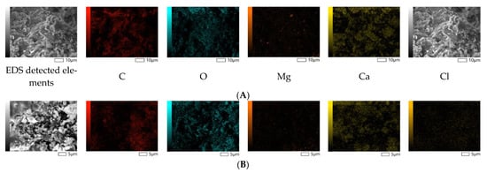 The reference and polymer composite samples were also studied using the EDS method, indicating the contents of the main elements in the selected spots. The major fractions of both the reference and modified polymer composites consist of calcium, oxygen, carbon (97.31 wt.% and 99.49 wt.%), and a trace amount of magnesium. The most important finding is the detection of chlorine in the amount of 1.92 wt.%, which agrees with the chemical composition analysis, as presented in Table 6. Taking into account the molecular weight of chlorine within the organic structure of triclosan, we may tentatively calculate the theoretical mass of chlorine from the initially loaded 5 wt.% triclosan, which corresponds to 1.83 wt.%. This value is comparable to the average elemental analysis results (1.79 wt.%); therefore, we may assume that almost all loaded triclosan is homogeneously distributed within the polymer matrix.