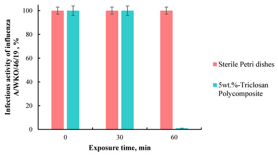 Triclosan was selected for its efficiency not only as an antimicrobial agent but also as a compound that shows some antiviral activity. Thus, the reduction in virus infectivity after a 30 s contact time with triclosan at 0.05% illustrated 4.8 log10TCID50/mL, comparable to the action of 0.21% Sodium hypochlorite [43]. Another study has shown that 0.6% triclosan in soap has log10TCID50 values of 0.25 and 0.5 for 0.5 and 2 min contact times, comparable to 3% hydrogen peroxide [44]. The determination of virucidal activity is one of the main approaches to assessing the effectiveness of antiviral drugs and materials. Therefore, the virucidal activity of a self-disinfecting composite triclosan-containing material was studied using a human influenza virus model, epidemic strain of 2019—A/ZKO/46/1.