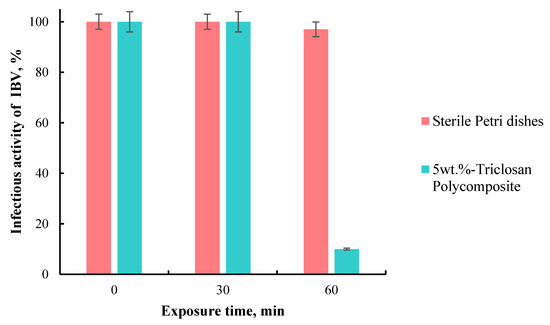Thus, it was found that the contact of IBV with the surface of a composite triclosan-containing material within 60 min reduces its infectious activity by 90%. Therefore, this material can be used for combating and preventing coronavirus infections. These data are in agreement with the previous confirmation of the antiviral activity of triclosan; the test results illustrate that the rate of decline in the virus titer is 3 log for triclosan-immobilized cotton textiles, while the untreated cotton textile causes no decline [24,45].