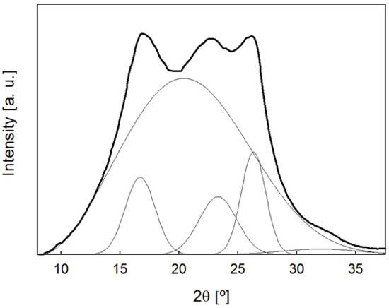 Two-dimensional wide-angle X-ray diffraction (WAXS) images were obtained with the fiber axis perpendicular to the incident beam, using a Bruker AXN diffractometer operating at 50 kV and 1 mA, with wavelength λ = 0.1542 nm. The beam size was around 100 μm × 100 μm. A photon detector was used with a resolution of 1024 × 768 pixels and 135 μm/pixel. The sample-to-detector distance was 40 mm. Background-subtracted diffraction patterns were analyzed using the FIT2D software [43]. Azimuthal scans over the main crystalline reflections showed no intensity maxima and this suggested no preferred crystal orientation. All diffraction images were integrated along the azimuthal angle to obtain intensity curves as a function of diffraction angle. As an example, Figure 2 shows the intensity profile for the PET/graphene 5 wt.% fiber. The Peakfit program (Systat Software, San Jose, CA, USA) was used to fit the intensity curves to several crystalline peaks and an amorphous halo, as shown in Figure 2. The degree of crystallinity, Xc, was calculated from the ratio of the area under the crystalline peak to that of the total diffraction curve.