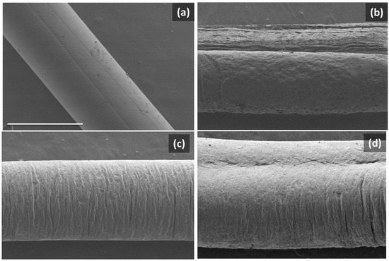 Figure 4. SEM images of the surfaces of dry-jet-wet-spinning-produced fibers: (a) PET and PET/graphene with loadings of (b) 2 wt.%, (c) 4 wt.% and (d) 5 wt.%. Scale bar in (a) applies to all images and corresponds to 500 microns.