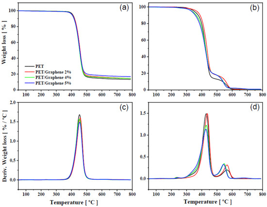Figure 6. TGA and dTGA curves for PET and PET/graphene nanocomposites with different graphene loadings under nitrogen (a,c) and air (b,d) atmospheres. Heating scan = 5 °C·min−1.