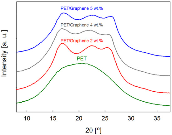Figure 7. Scattered intensity as a function of diffraction angle for pristine PET and PET/graphene fibers with different filler content. Curves are shifted for the sake of clarity.
