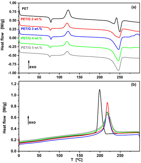 The fibers were also analyzed by DSC and the curves of the first heating scan are shown in Figure 8a. On heating, after the glass transition at around 70 °C, all fibers presented a cold crystallization process at around 122 °C. However, the crystallization enthalpy of this process was much smaller in the fibers with graphene as compared with pure PET fibers, corroborating the presence of initial crystallinity due to the nucleating effect of graphene, as observed in the X-ray results described above. This nucleating effect was clearly detected in the subsequent cooling scans from the melt after eliminating the thermal history of the fibers (Figure 8b). The crystallization temperatures of the nanocomposites were ~20 °C higher than that for the neat polymer. A similar increase was observed for nanocomposites of PET with different grades of graphene oxide, prepared by melt mixing [33,34] or electrospinning [30].