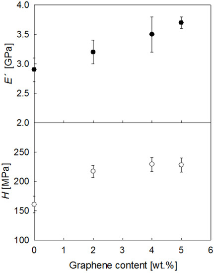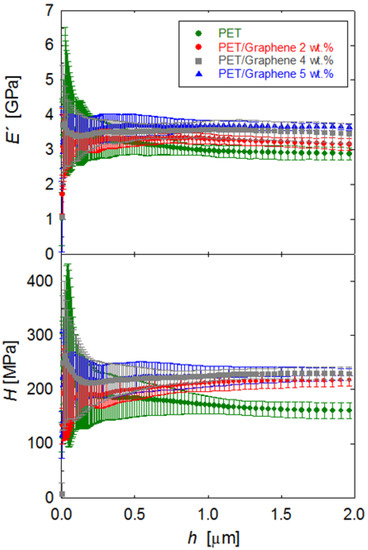 Figure 10 shows the plot of the and H values taken at h = 2 μm as a function of graphene content for all materials investigated. In the first place, the and H values for the pristine PET fiber are in agreement with earlier values in other PET systems [57,58]. Moreover, it is seen that the addition of graphene enhances the modulus and hardness values of the PET fiber. For the largest quantities of graphene, and H improvements of 28% and 42%, respectively, are found. The initial and H improvement with the incorporation of the smallest quantity of graphene (2 wt.%) can be associated with both the development of matrix crystallinity (from Xc = 0 to Xc = 28%, see Table 1) and the intrinsic superior mechanical properties of graphene. The addition of larger graphene quantities is found to produce further mechanical enhancements, and this can be solely attributed to the filler, taking into account that the matrix crystallinity remains almost constant (see Table 1).