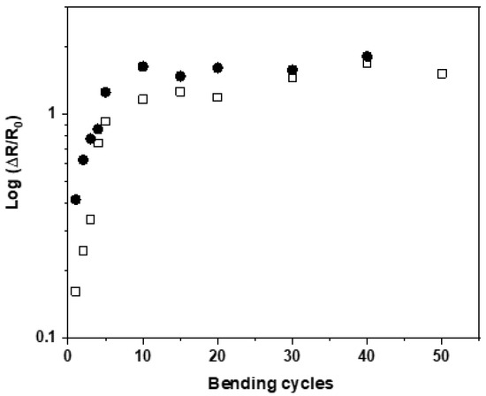Regarding e-textile applications, it is very important that the conducting fibers preserve the conductivity under mechanical deformation, recovering their initial values after the perturbation is released. Thus, the variation in the resistance of the nanocomposite fibers under repetitive bending/release cycles was investigated. Figure 11 shows the variation in the resistance of the fibers containing 4 wt.% (open squares) and 5 wt.% (full circles) of graphene subjected to fifty bending cycles. It can be seen that despite an initial increase in the electrical resistance, the values stabilize, showing only small variations from cycle 5 to 50. The significant increase in electrical resistance during the first bending cycle could be due to some rearrangement of the filler within the polymer matrix.