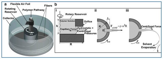 (a) A centrifugal spinning device constructed out of a hollow reservoir (b) mechanism of formation of nanoscale fiber through centrifugal spinning, polymer jet (i) initiation, (ii) stretching and (iii) solvent evaporation. Reprinted with permission from Ref. [28]. Copyright 2010, American Chemical Society.