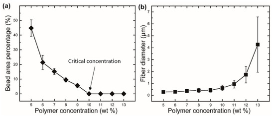 Variability of (a) beaded zone % and (b) diameters of recycled poly(ethylene terephthalate) (rPET) fibers fabricated from different polymer concentrations [62].