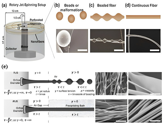 Variable PLA fiber morphologies. (a) Schematic of the spinning setup. (b) beads, (c) beads-on-string, (d) fiber showing continuity. Reprinted (adapted) with permission from [64]. Copyright 2014 American Chemical Society, (e) conventional nanofibrous spinning techniques that depend on volatile solvents result in beads. Fibers spun with the centrifugal spinning technique reduce surface tension due to the precipitating bath, stalling Raleigh–Plateau instability to generate bead-free fibers [20].