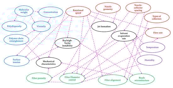 Schematic of the interdependence between the ambient parameters (purple), polymer melt or solution characteristics (blue), machine parameters (red), and other dependent variables (black) on the fiber morphological characteristics (green) derived from various sources [6,16,17,22,60,62,64,74].