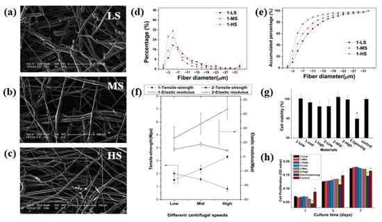 SEM image of melt−spun PLA fibers at various rotational motions (a) low speed (LS) (b) mid−speed (MS) (c) high speed (HS) (d) Frequency (e) accumulated frequency distribution of fiber diameters (f) effect of speeds on mechanical properties (g) cell cytotoxicity and (h) cell proliferation on the fibers. Asterisk (*) denotes statistical significance p < 0.05 [29].