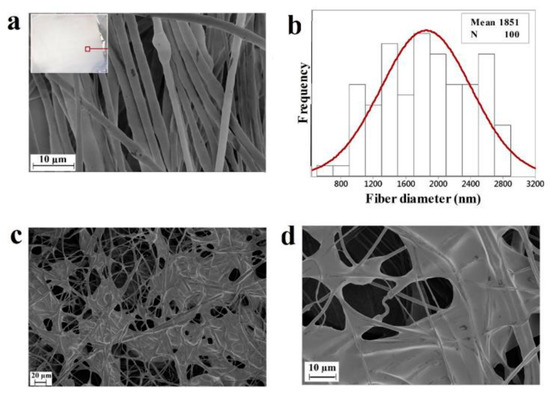 (a) Micrograph of polyhydroxy butyrate (PHB) fibers with fiber mat (inset image) and its (b) diameter distribution, and multiple magnifications of (c) 20 μm and (d) 10 μm of a PHB film that had been covered with SOJ [86].